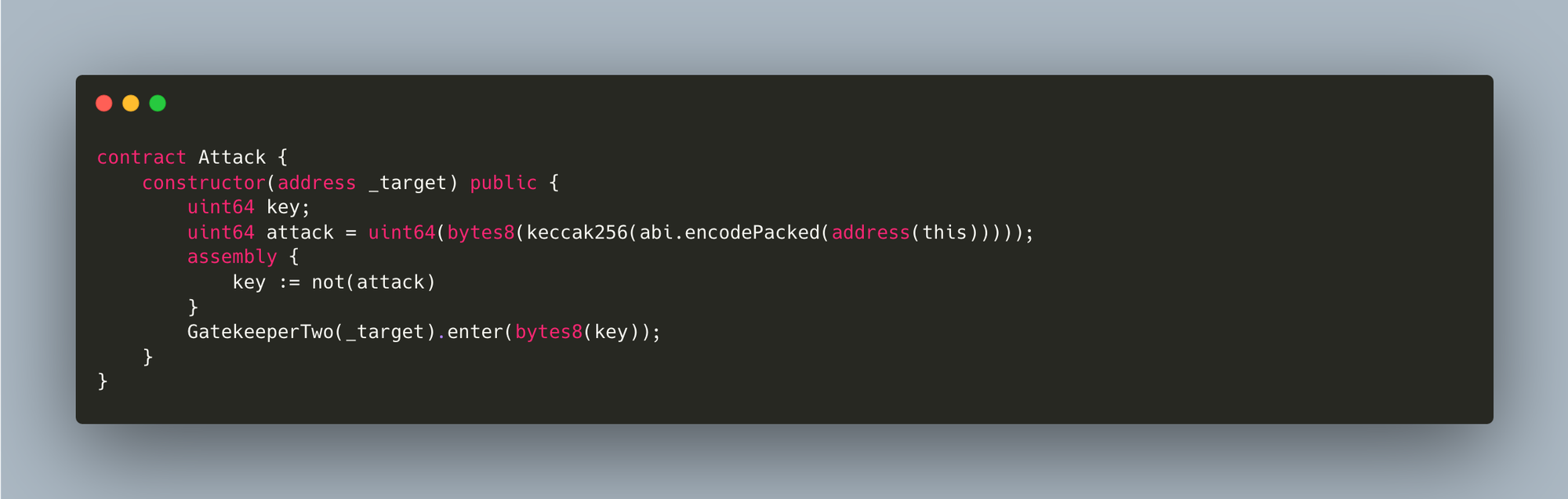 - The 2nd modifier requires that the extcodesize of our contract equals 0 (msg.sender is caller() in yul). Until the constructor() is executed successfully, extcodesize(addr) = 0 because it's not deployed yet, we should take advantage of that and call enter() with the correct _gateKey from the constructor()