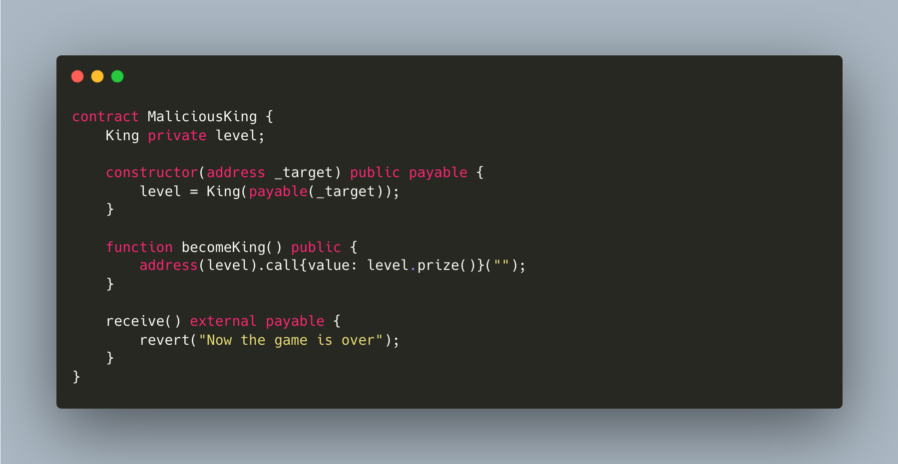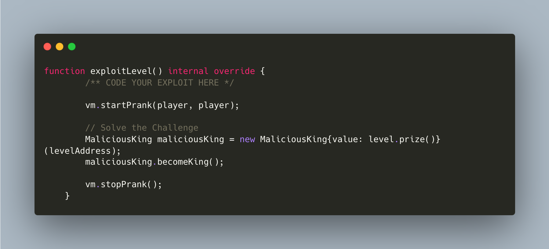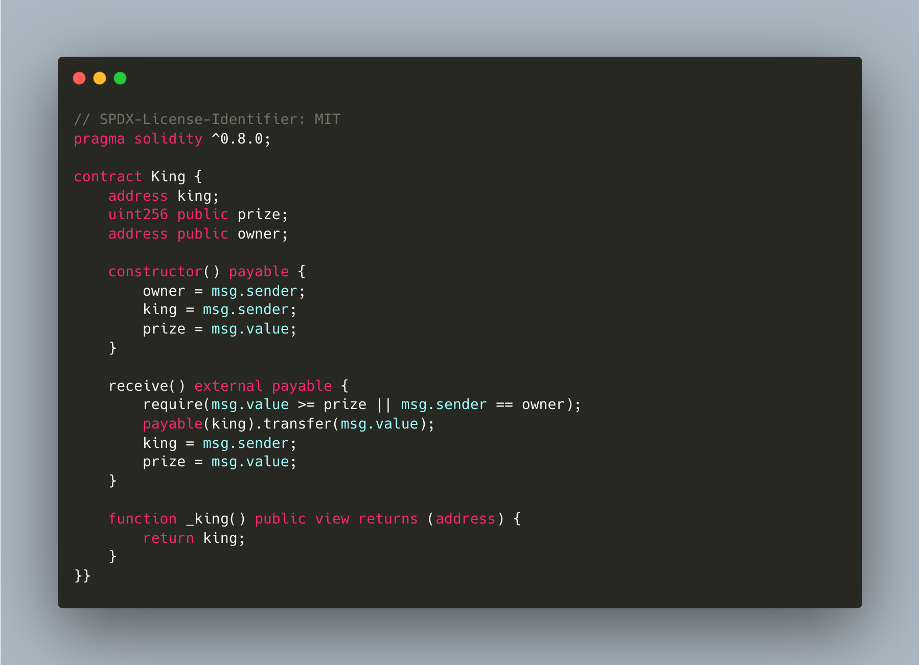 - Now that we are king, we submit the instance, the level will try to reclaim kingship by sending to it a certain amount of ETH >= prize, we have to prevent them from happening, we're only involved when we get sent the prize that the wannabe king is trying to set, this call can revert if the king declines the payout by reverting upon receipt of the new prize that will never be one since we're going to revert