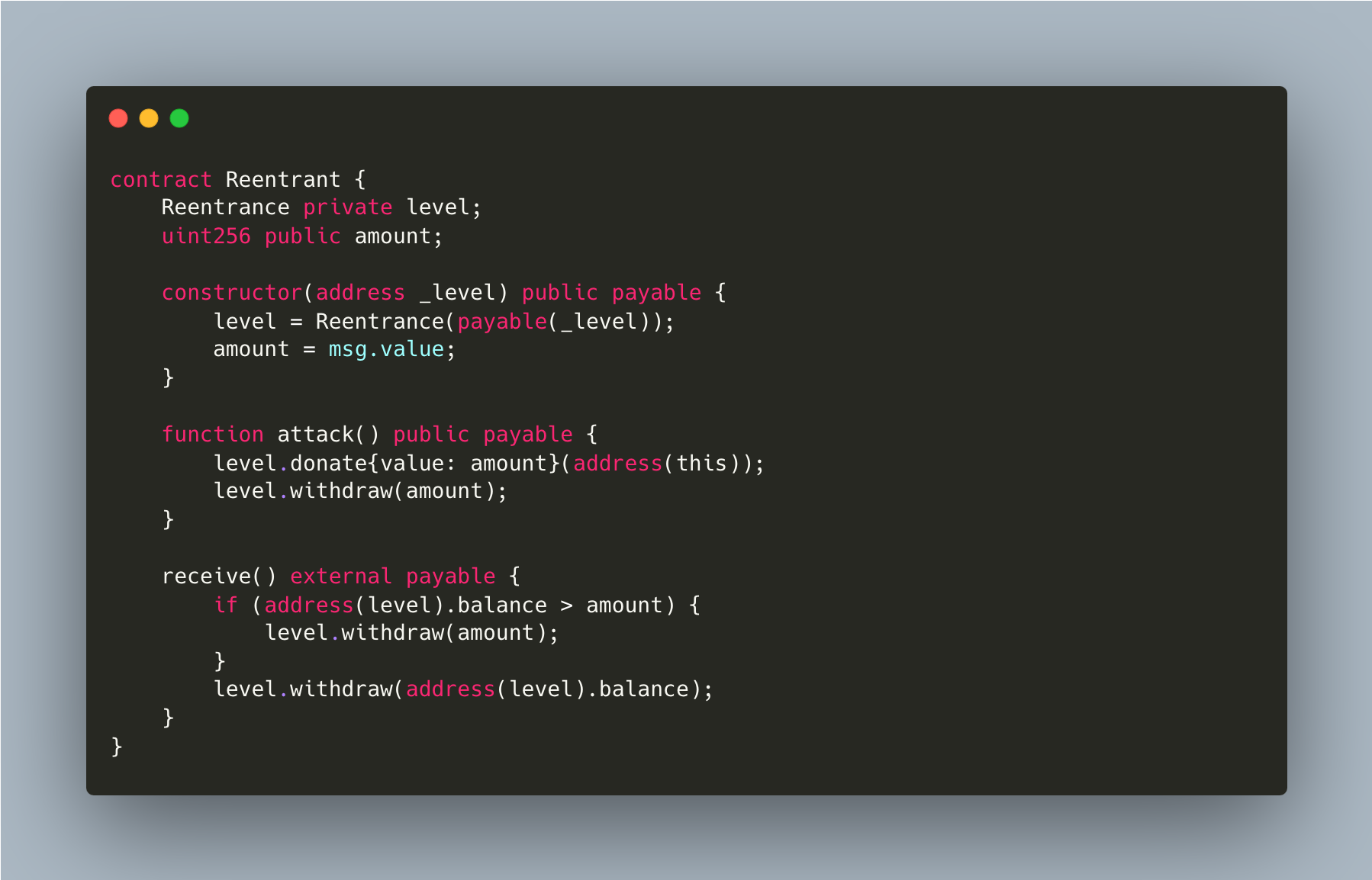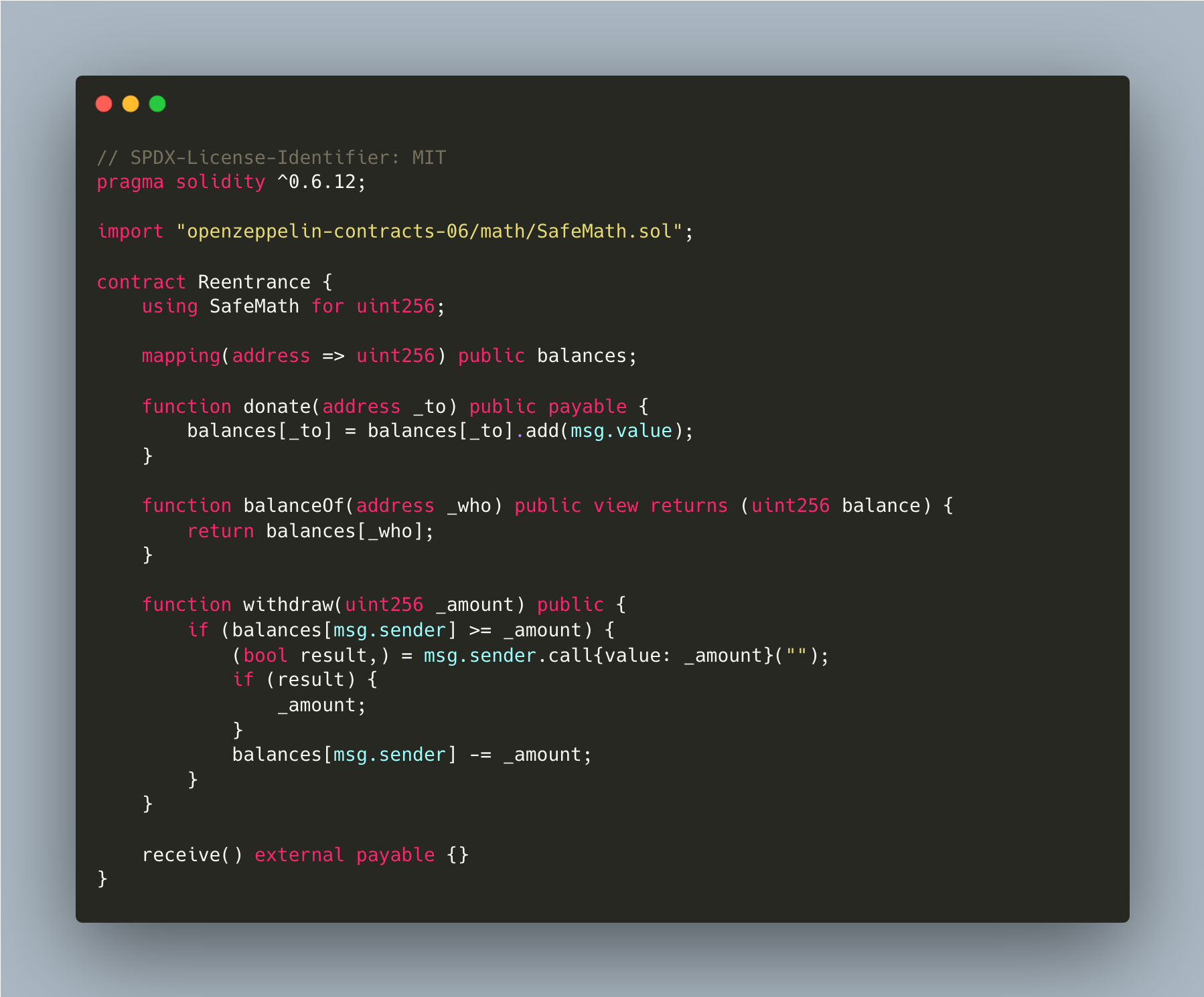 - In order to call this vulnerable withdraw() function we first need a balance greater than the _amount we're going to pass as argument to withdraw() in each of our call